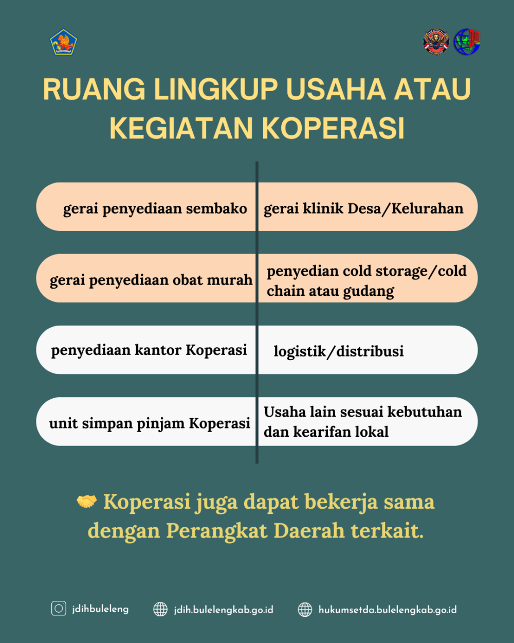 Untuk itu, hadir Peraturan Bupati Buleleng Nomor 39 Tahun 2025 tentang Penyelenggaraan Koperasi Desa/Kelurahan Merah Putih yang ruang lingkupnya meliputi: